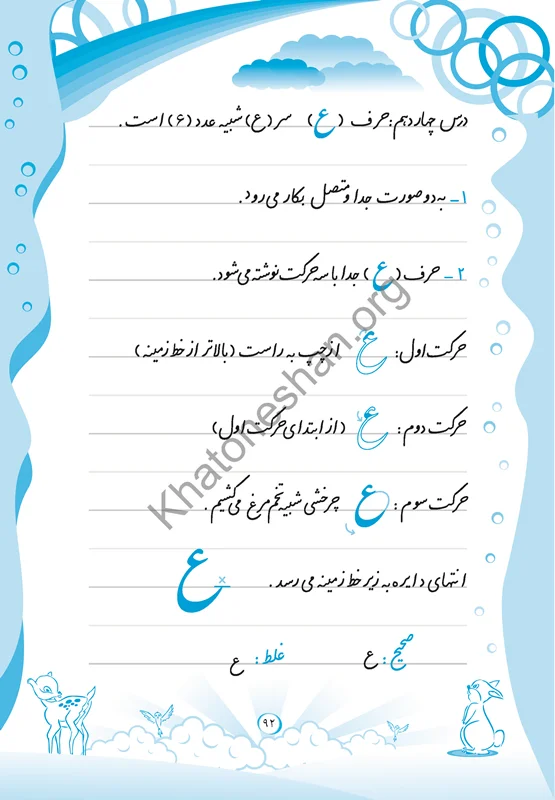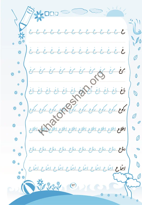 - صفحه دوم: تمرین مفردات حروف و کلمات مرتبط با درس.